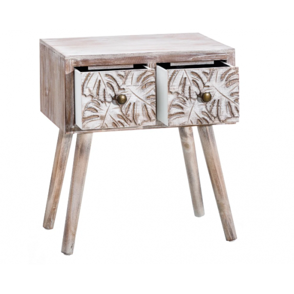Table de chevet 151261, structure en bois de pin, 2 tiroirs avec décor végétal, finition : natural et blanc, L.48 P.30 H.53,50.