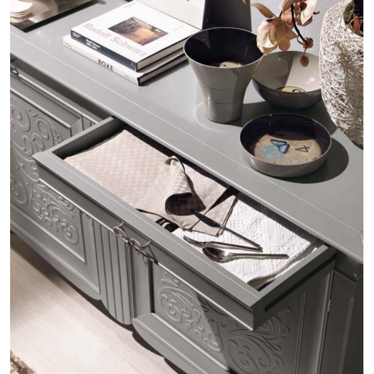Buffet 6001 structuré en bois, composé de 2 portes, 2 tiroirs, agrémenté de superbes marqueteries dans les 2 portes. Rainures spéciales au centre, finition laquée grise. L.192 P.54,5 H.104.
