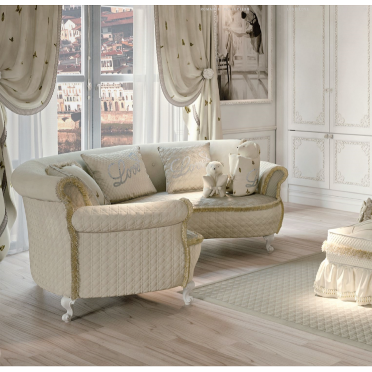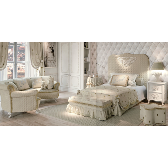Letto Charlotte 1171 con struttura in legno rivestita con gonne e 2 faldoni , testata con decoro floreale Finitura Col 33 , rete 120x195 , L.156 P. 215 H.196.