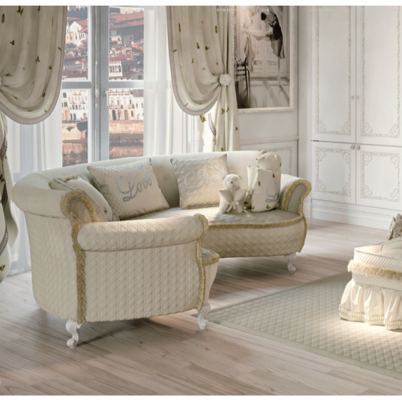 Divano Amedeo 620S struttura in legno rivestita in Cat H 78021 , schienale e bottoni in Cat E 75081 con spazzolino SPLOVE02 e cordone COLOVE02 , retro schienale, braccioli e piedi sagomati in Finitura COl 56 , L.238 P.138 H.121.