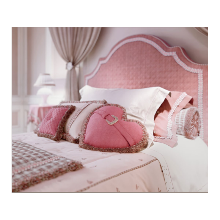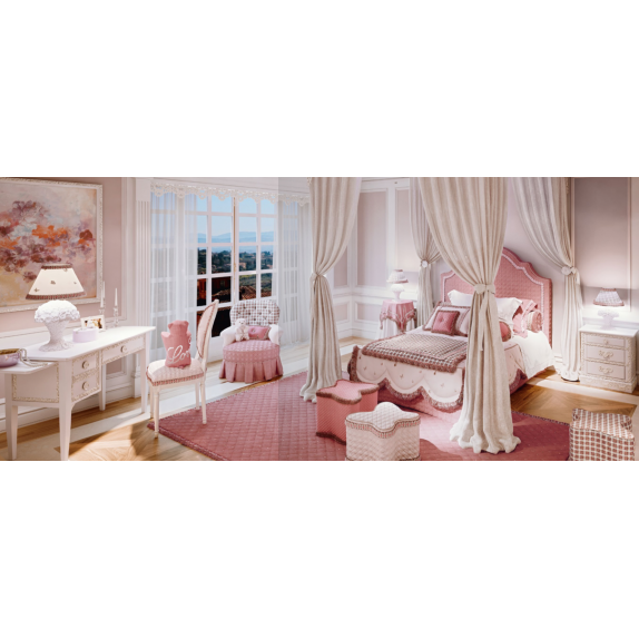Letto Spencer 120 - 171 struttura in legno rivestita in tessuto Cat H 78027 , con gonna a 2 faldoni , testiera con bordo decorato da fiori BOLOVE08 e cordone COLOVE 08 , rete a doche compresa da 120x195 , L.140 P.215 H.179.