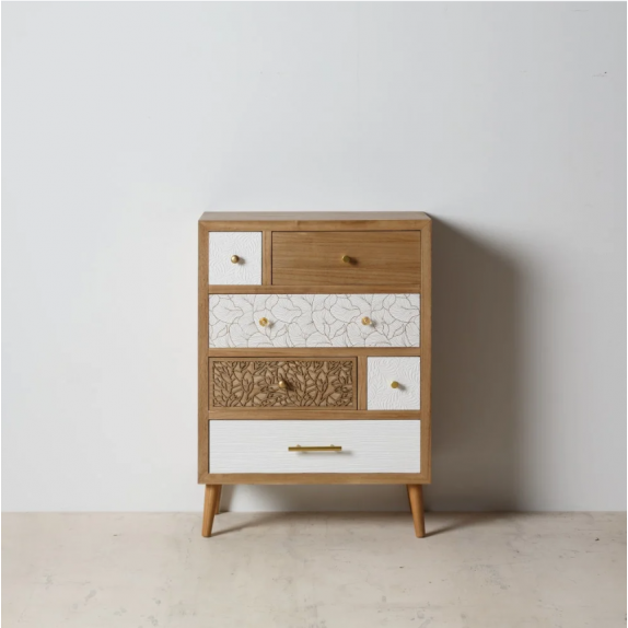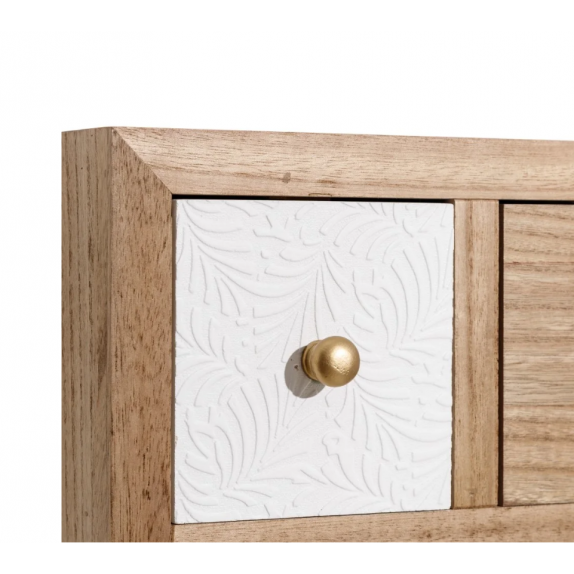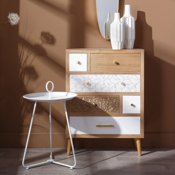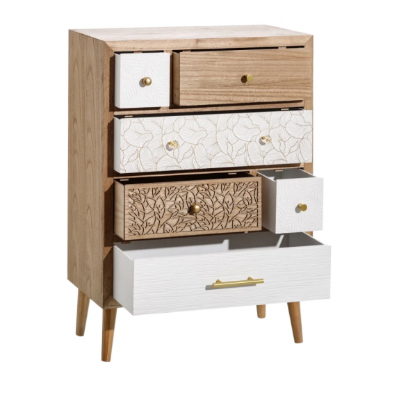 Comò 151250 struttura principale in legno di paulownia rivestita in vinile di pino, attrezzato da 6 cassetti con decori floreali, finitura naturale e bianco, L.67 P.34 H.86.