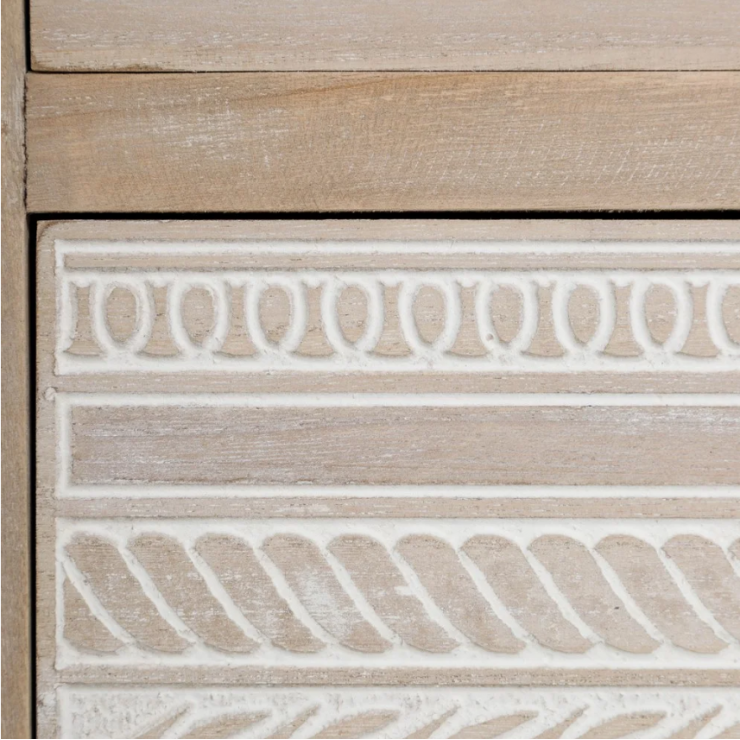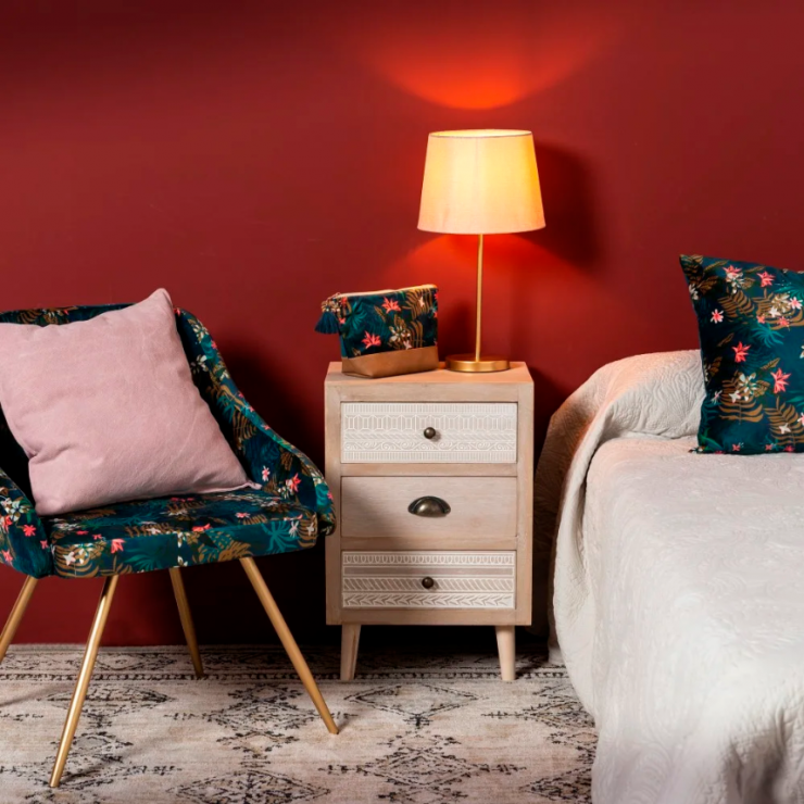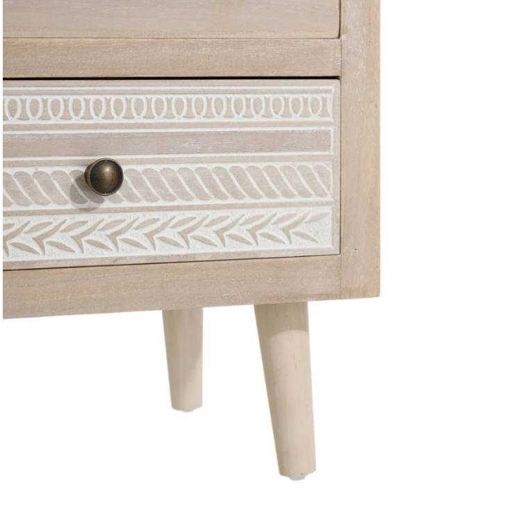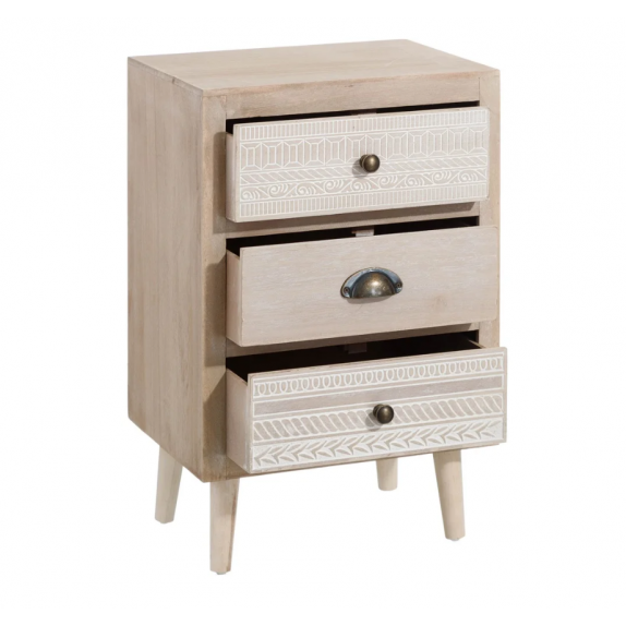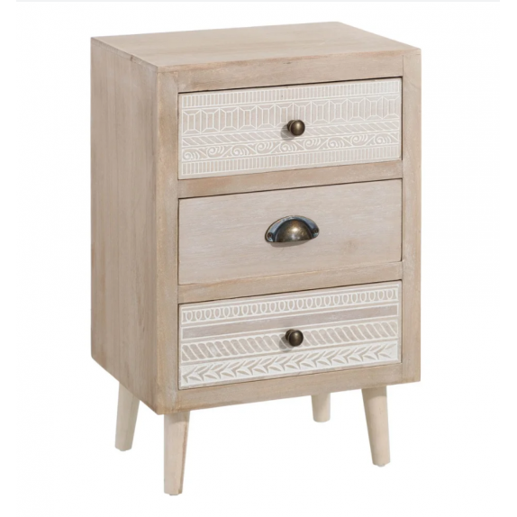 Comodino 108.238 a 3 cassetti con struttura in legno di pino, finitura naturale e bianco, L.40 P.30 H.60.