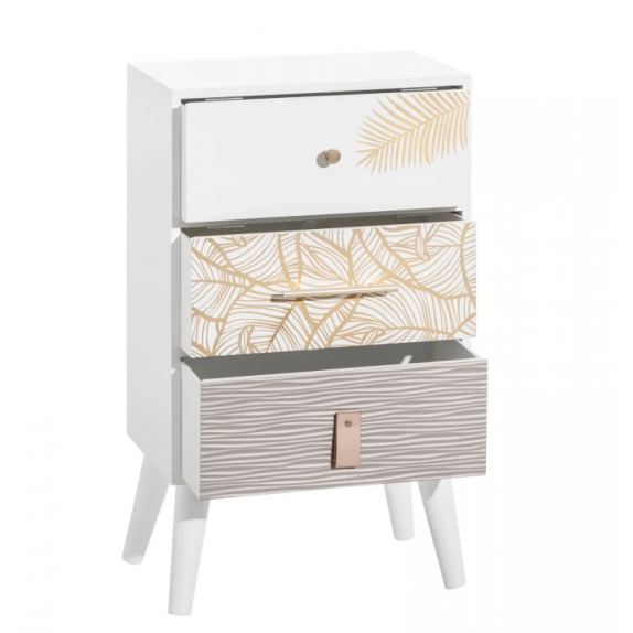 Comodino 121821, struttura in legno di pino,attrezzato di 3 cassetti con decori differenti , finitura bianco e oro, L.40 P.30 H.69
