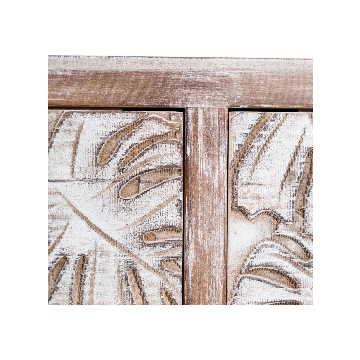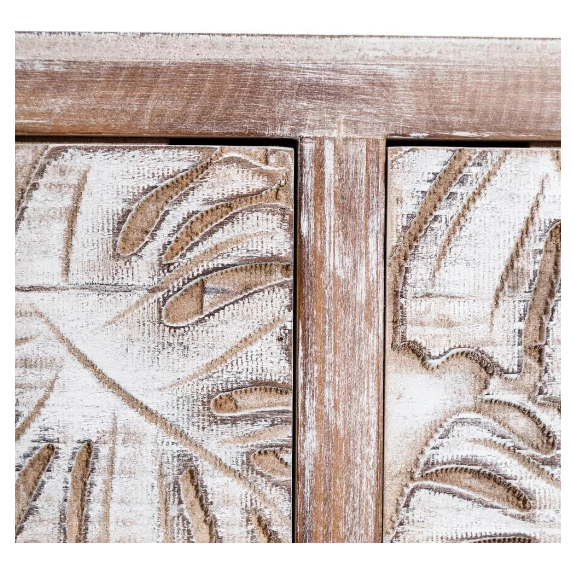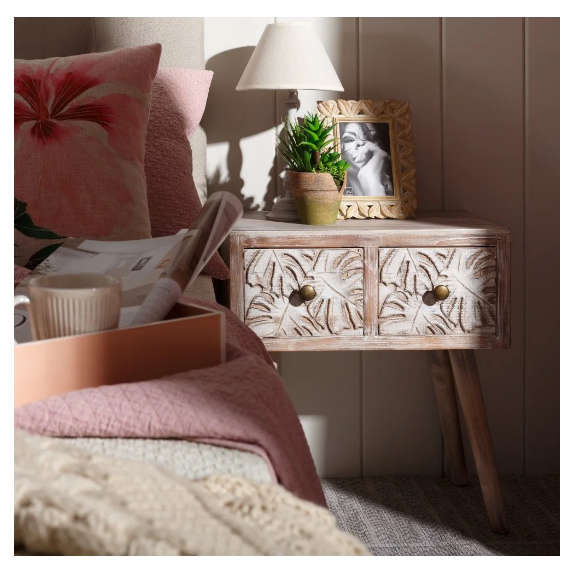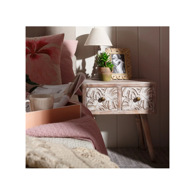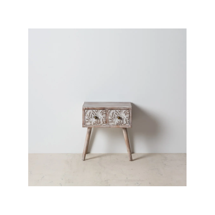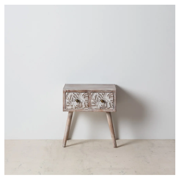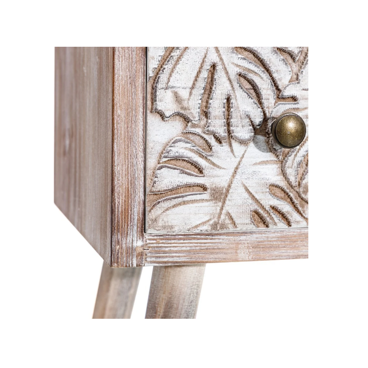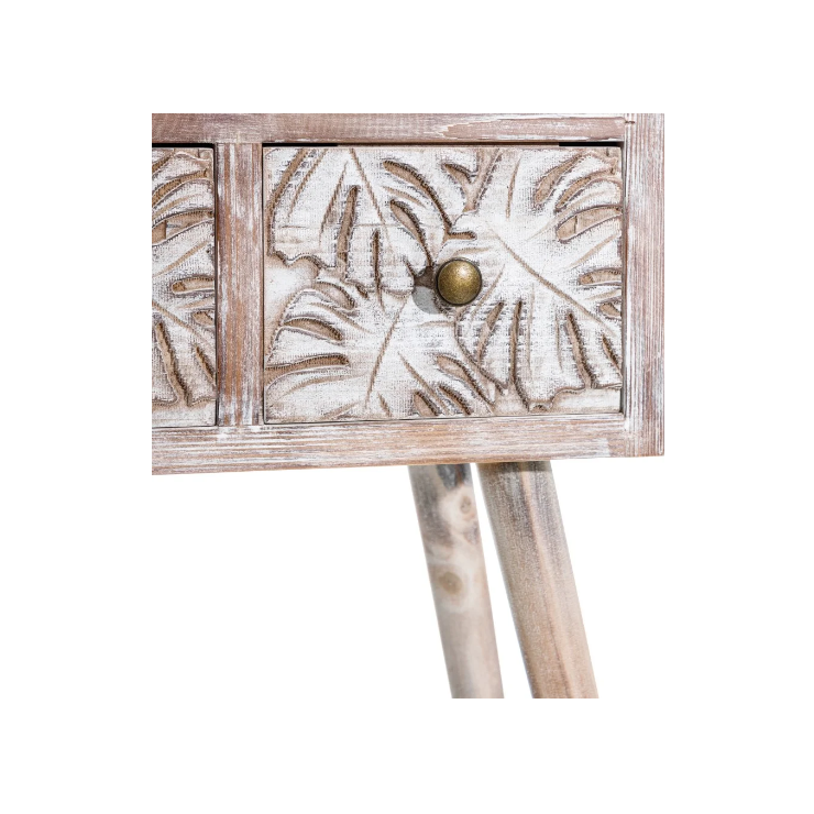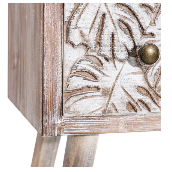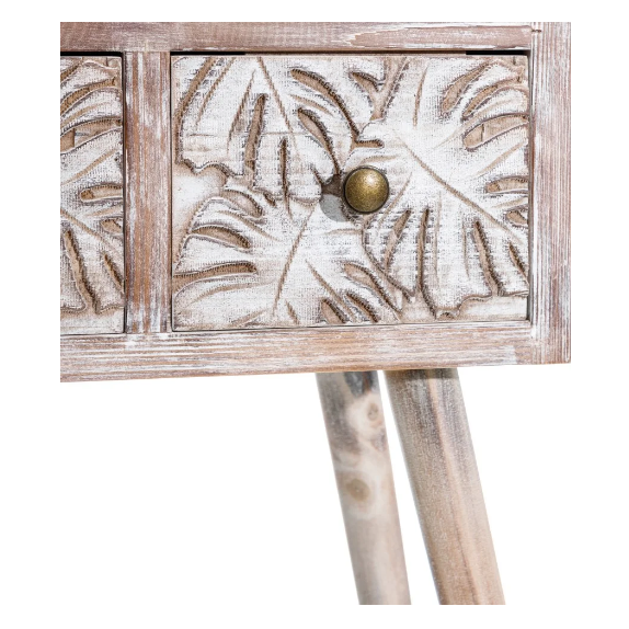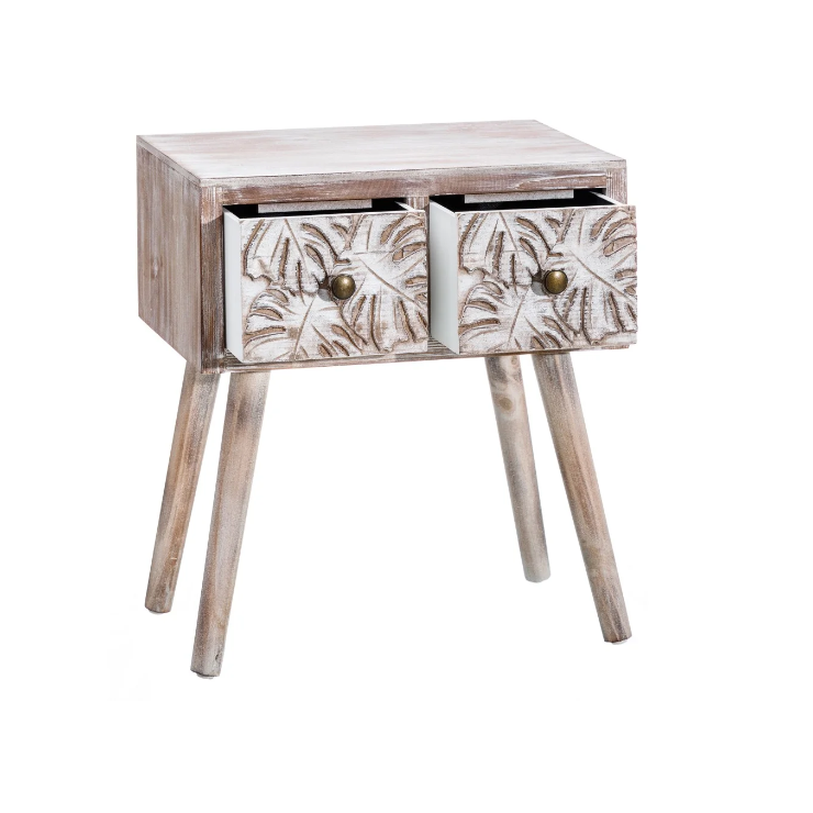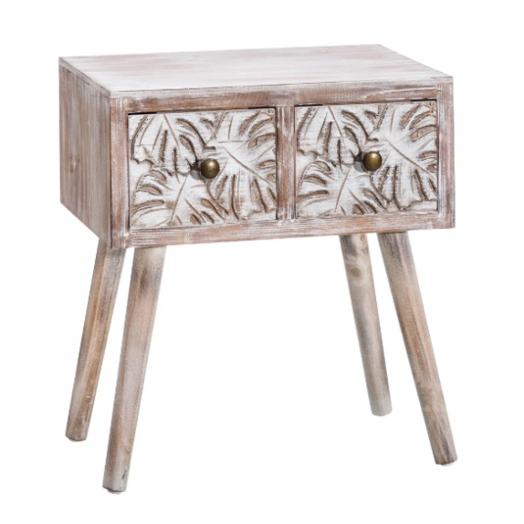 Comodino 151261, struttura in legno di abete, attrezzato di 2 cassetti con decori vegetali,finitura naturale e bianco, L.48 P.30 H.53,50.