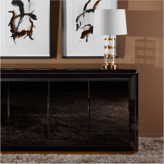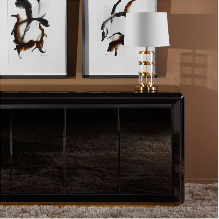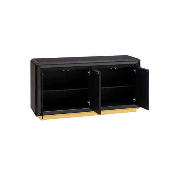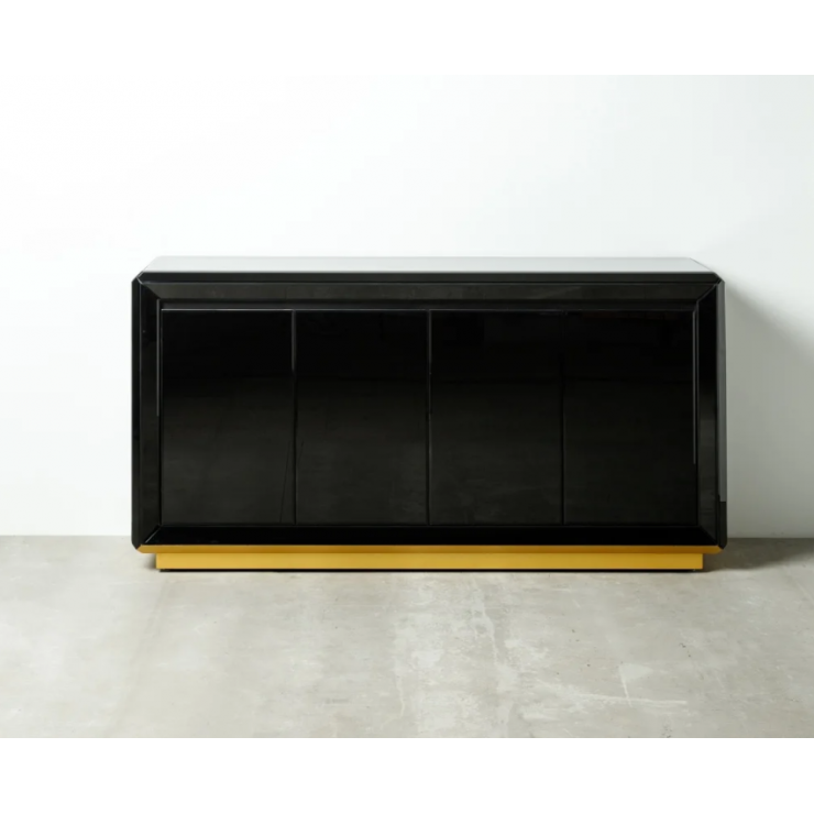 Credenza 121968 strutturata in legno e ricoperta in vetro color nero, attrezzata da 4 ante, gambe in acciaio inossidabile color oro, L.180 P.50 H.90.