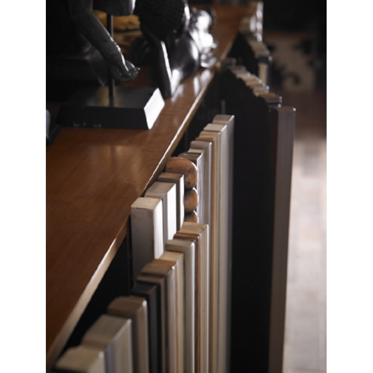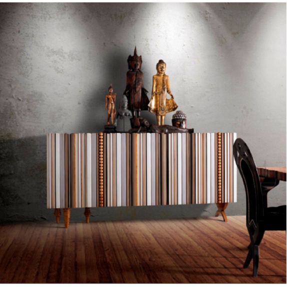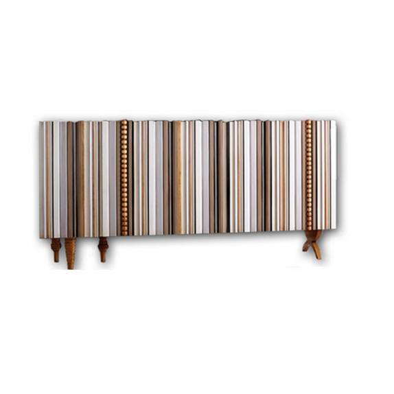 Credenza 5 ante con la parte frontale di più modanature multicolori.