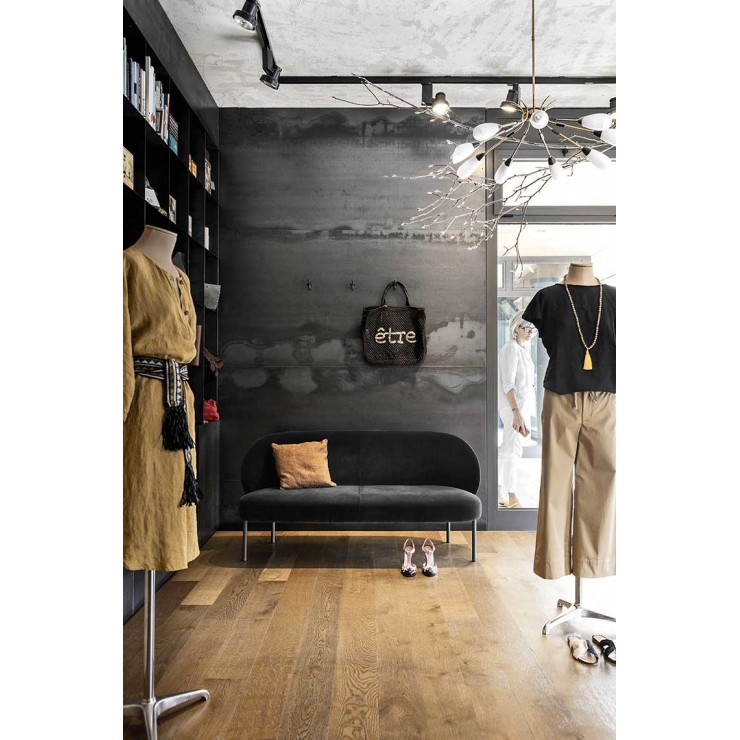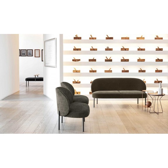 La collezione di sedute imbottite RAKU – che comprende poltrona + pouf, divanetto, sedia e panca – ha un'immagine contemporanea ed essenziale. Seduta e schienale sono defi niti da volumi semplici e arrotondati. Il piede, altrettanto essenziale, è formato da un tubo verticale che sembra solo appoggiato all'esterno dei volumi. La panca imbottita prevede anche un bracciolo in legno che la divide trasversalmente creando un funzionale piano di appoggio. Disponibile con rivestimento in pelle e in tessuto, RAKU è perfetta per regalare un tocco di comfort alla zona giorno, come alla zona notte.