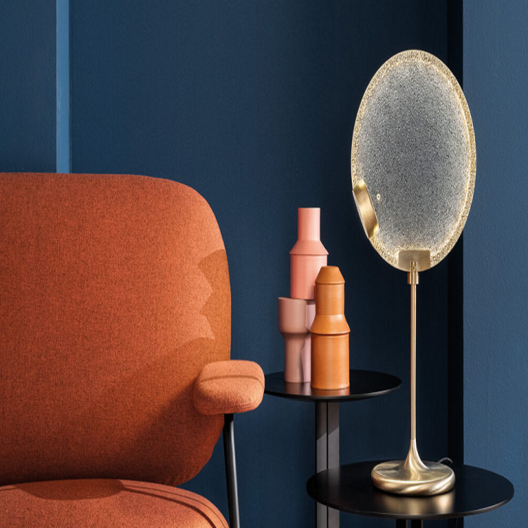 Horo è una lampada da tavolo che si caratterizza per la forma minimale e le finiture particolari di metallo e vetro: per il metallo è stata selezionata una finitura ottone spazzolato, per il disco di vetro oltre il trasparente, una gamma di colori semitrasparenti molto raffinati come il blu chiaro, il rosa polvere, il fumé ed un vibrante verde. La struttura in metallo dall’aspetto dorato contiene un disco di vetro prismato, con la particolare finitura a motivo punta di diamante.