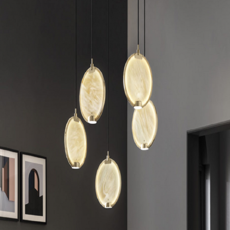 Ogni diffusore ha una struttura in ottone e pende da un baldacchino rettangolare dal soffitto.