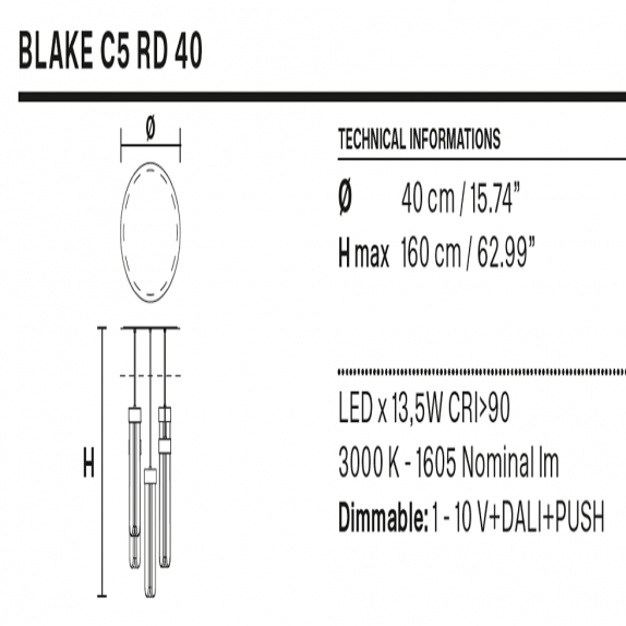 Blake C5 RD 40 è un lampadario a sospensione con illuminazione LED realizzato in metallo e vetro. Interamente realizzato in Italia dall'azienda Masiero, leader nel settore dell'illuminazione decorativa d'alta gamma, dove tradizione e innovazione si fondono, dando vita a creazioni di alto valore artistico, esclusivamente ed orgogliosamente Made in Italy.