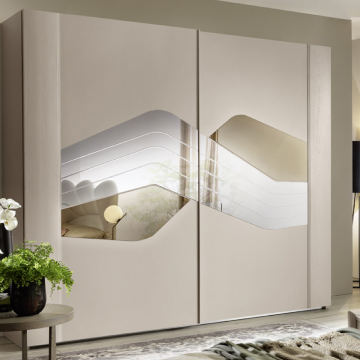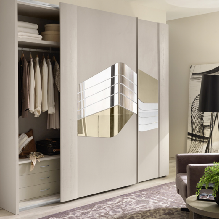 CHLOE è un armadio con due ante scorrevoli con specchi, con 2 ripiani, 3 tubi appendiabiti in alluminio e personalizzati RTL e 1 cassettiera interna con 3 cassetti.