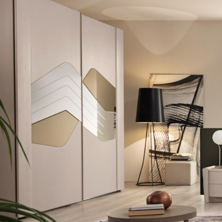 Camera da letto composta da: Letto FLO', comò e comodini CHLOE, Armadio CHLOE e specchiera CHLOE.