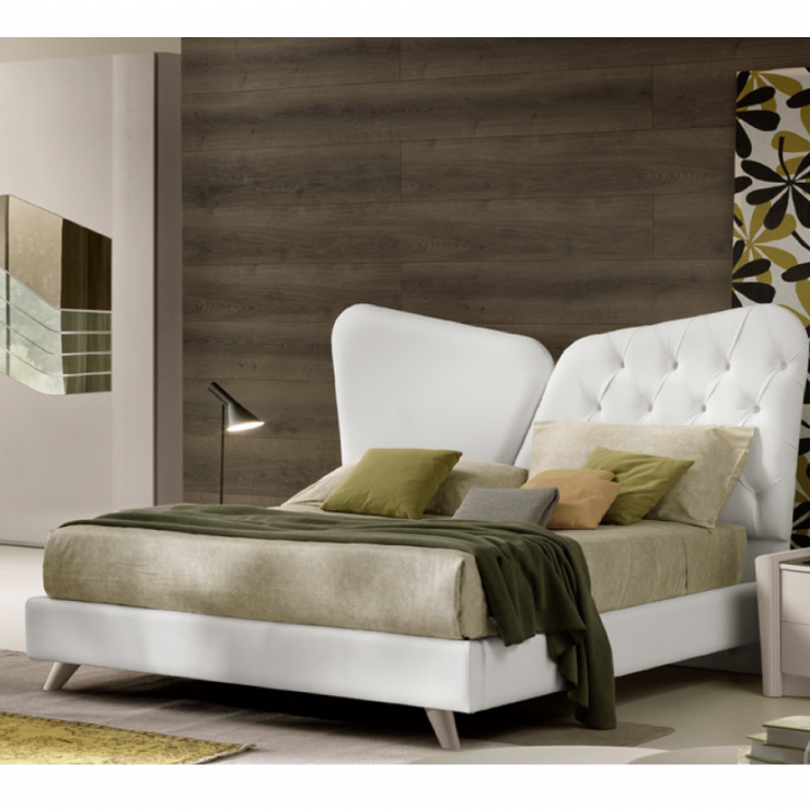 FLO' è un letto matrimoniale moderno imbottito con testiera rivestita in ecopelle bianca che porta un tocco personale al tuo letto ed esalta lo stile della tua camera da letto. Di misure matrimoniale standard, consente esigenze di comfort e di spazio.