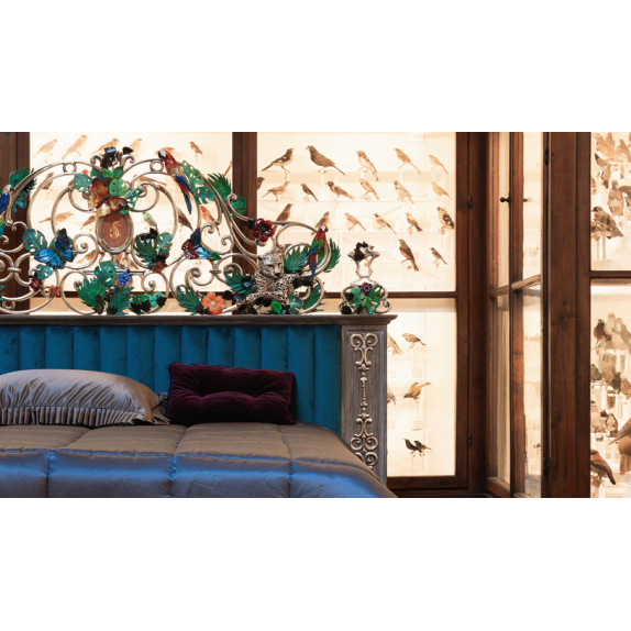 Letto 3645 con giroletto e rete strutturato in legno con intagli laterali e imbottitura rigata in tessuto Fabric A 5 W , parte alta in ferro battuto adornata da pappagalli , farfalle , foglie , fiori e una tigre realizzati a mano che costituiscono un pezzo unico e un vero punto d'incontro tra la natura e il design con le meravigliose finiture K01 e F49 , L.230 P.209 H.174.