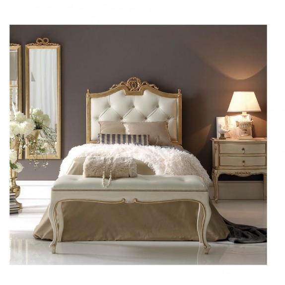 Letto Grifoni Silvano completo di giroletto art. 2383 con cornice intagliata sopra la testata finitura oro antico , imbottitura capitonnè in ecopelle panna , L.95 P.209 H.130 ( per rete consigliata con angoli stondati 90/200).