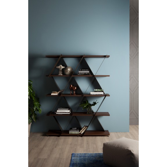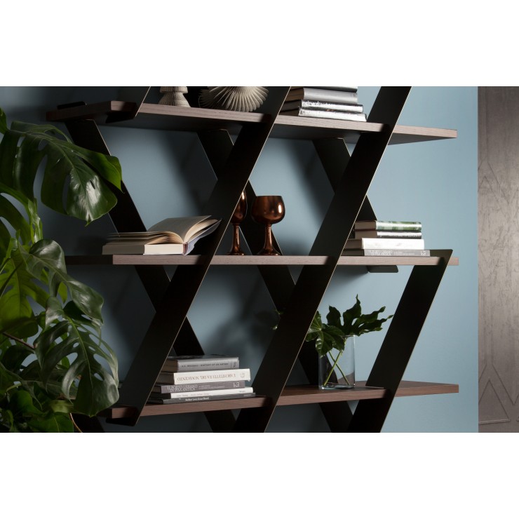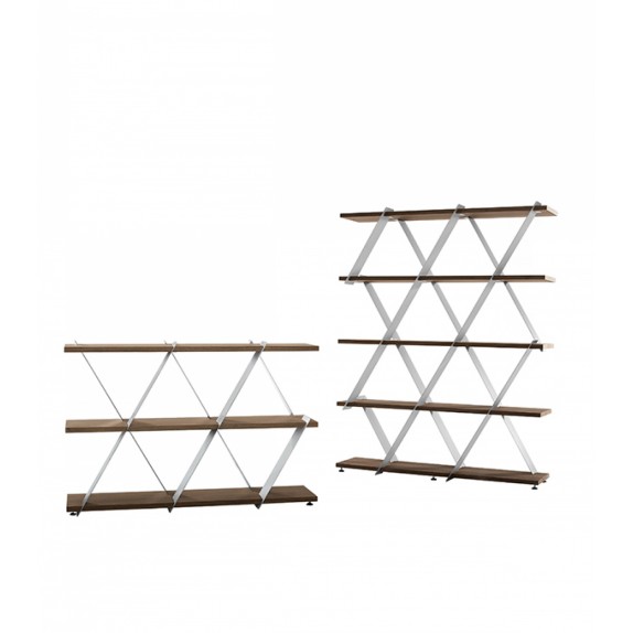 Una struttura leggera ed essenziale, che fonda la sua forza sugli spazi aperti, su triangoli di luce che invadono la presenza di metallo e legno. Come un castello di carte, Castle si riempie grazie ai colori, ai giochi di luce che ciascuna delle sue finiture è in grado di creare, e si modella a piacere, che sia posizionata in verticale o in orizzontale. Un magnifico gioco di design.