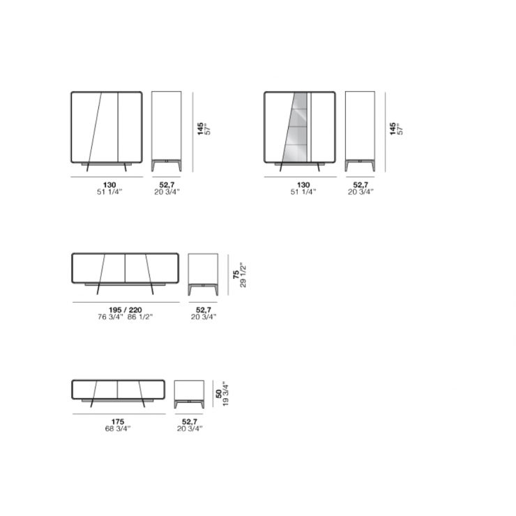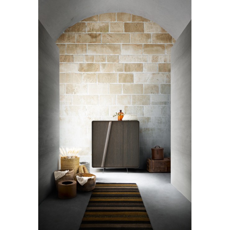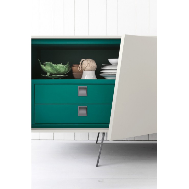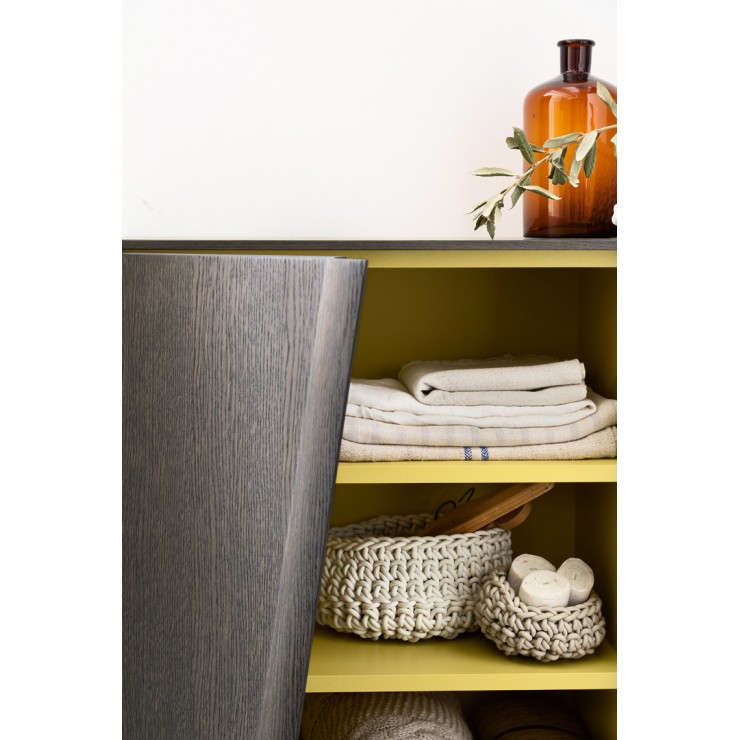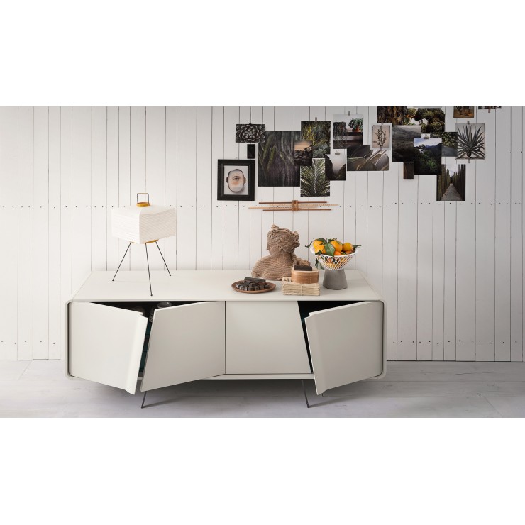 Musa è disponibile in versione credenza, madia o vetrina e si distingue per le forme arrotondate della scocca e per il taglio inclinato delle ante che celano la maniglia e proseguono nelle linee dei piedi in metallo verniciato. L’interno può essere laccato e dotato, nel caso della credenza, di una pratica cassettiera.