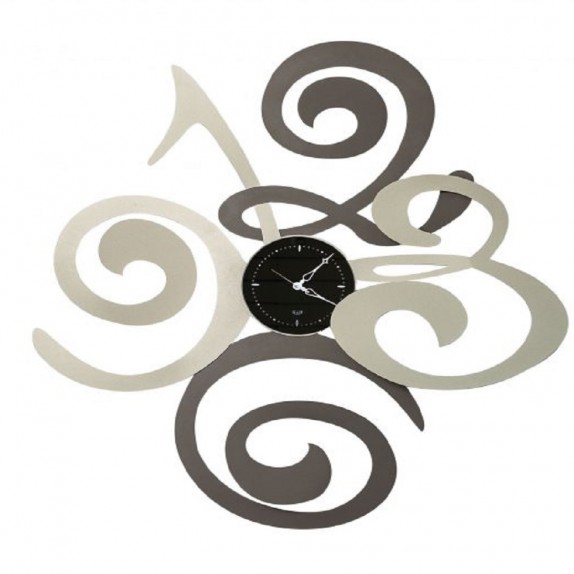Orologio da parete realizzato in ferro tagliato a laser, quadrante a specchio, forma di riccioli e linee tondeggianti, finitura fango e avorio, L.115 H.120.