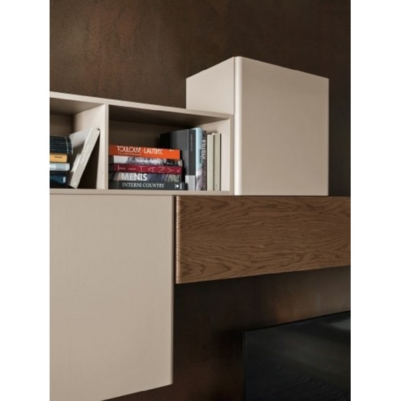 Composizione 4. La collezione Fiori di Loto di Le Fablier ha numerose soluzioni con un sistema di elementi componibili adattabili alle diverse esigenze e possibilità per ogni living che può essere personalizzato secondo i propri gusti. Le finiture possono essere in essenza: zenzero, zenzero tranchè, tabacco, tabacco tranchè, cenere, cenere tranchè, avorio, bianco e tortora; oppure in laccato opaco: avorio e grigio. In foto misure totali composizione L 495 cm P 50 cm basi P 38 cm pensili H 220 cm, finiture essenza tabacco e laccato avorio.