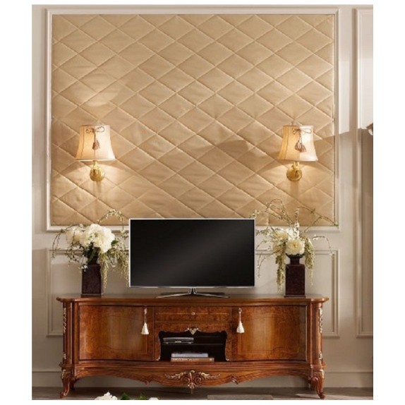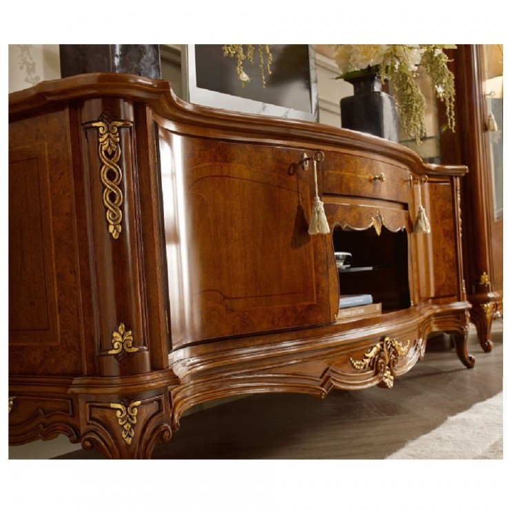 Base porta tv Casa Principe Valderamobili CPRE01/N strutturata in legno massello con intagli laterali e intarsi finitura noce con particolari in oro L 197 P 58 H 71 , attrezzata da 2 antine e 1 cassetto .