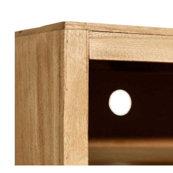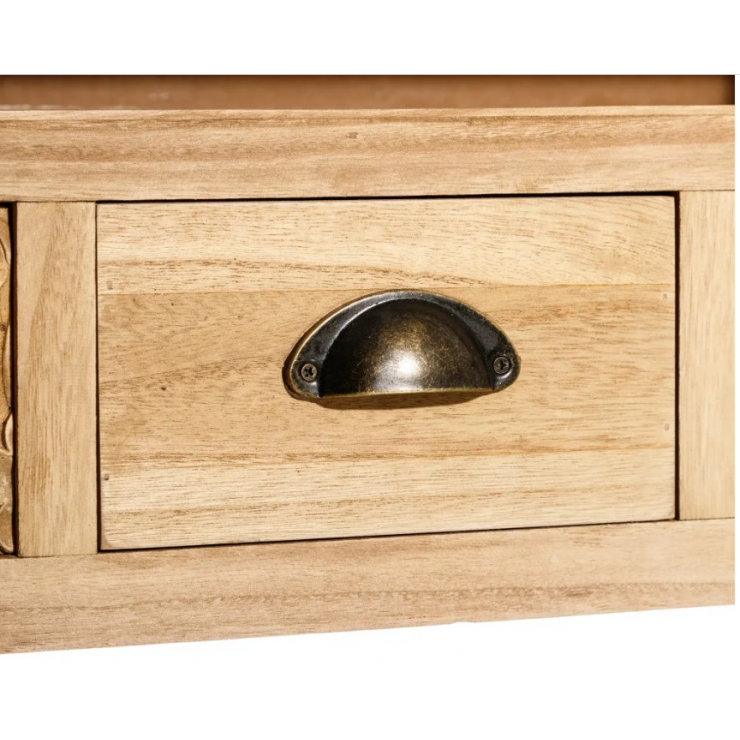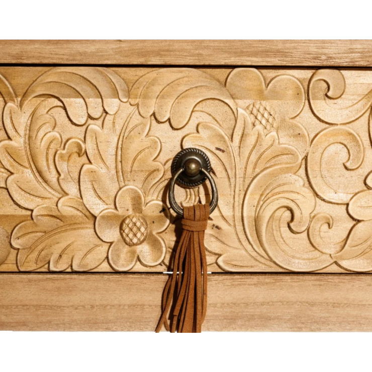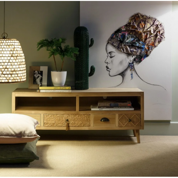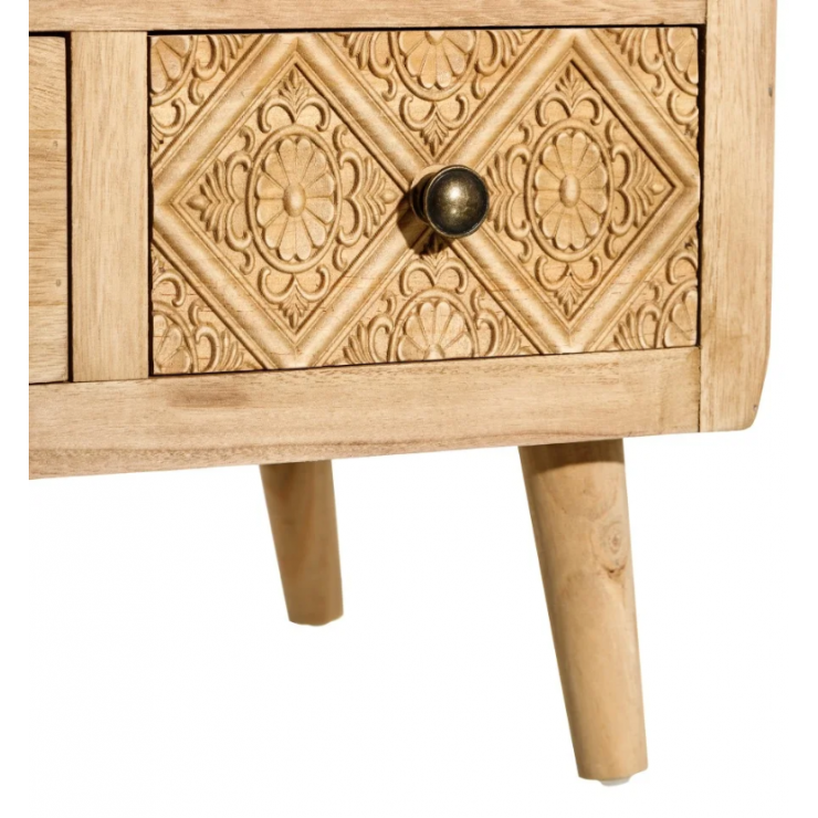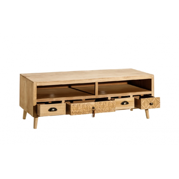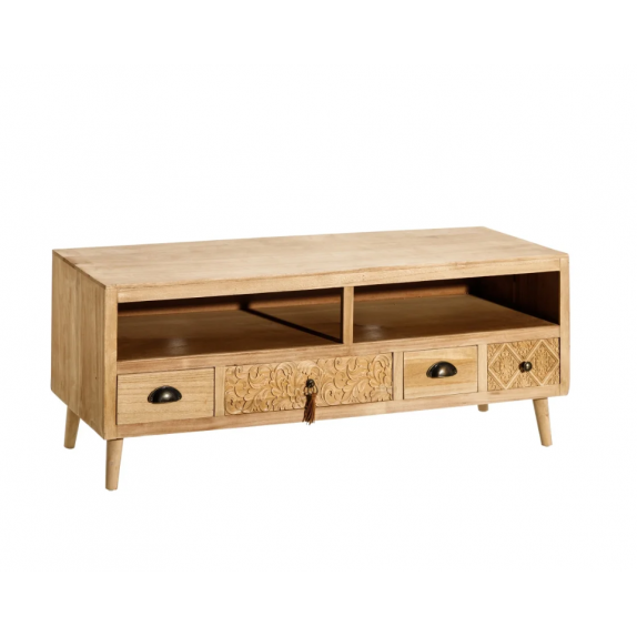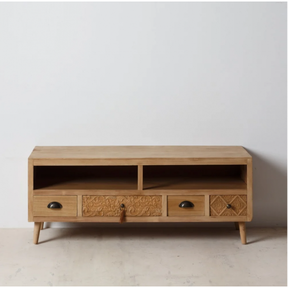 Mobile Porta Tv 151165, struttura in legno di paulownia con gambe in legno di pino,attrezzato di 4 cassetti con decori floreali,finitura legno naturale. L 119,50 P. 38 H. 47,50