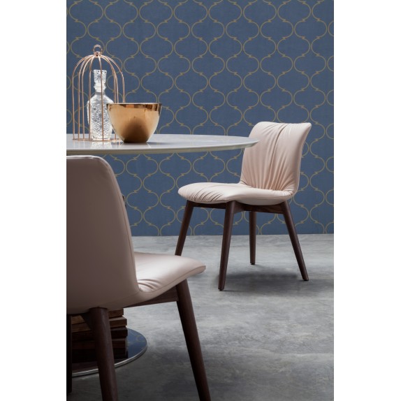 Sedia con base in legno e seduta rivestita in pelle, o ecopelle. Le gambe smussate spingono verso il centro della seduta, ed il legno così si abbina perfettamente, salendo, con le pieghe create ad arte sullo schienale: una linea continua che ricerca verticalità ed equilibrio.