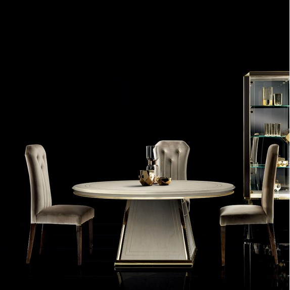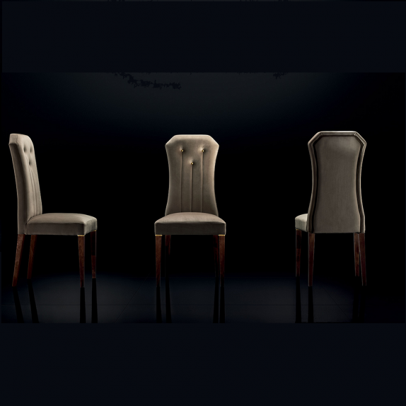 Le sedie della collezione Diamante sono progettate per unire comfort ed eleganza. Personalizzabili con diverse stoffe, riprendono il taglio triangolare al bordo dello schienale e si arricchiscono di nervature verticali impreziosite da bottoni nei colori dell'oro.