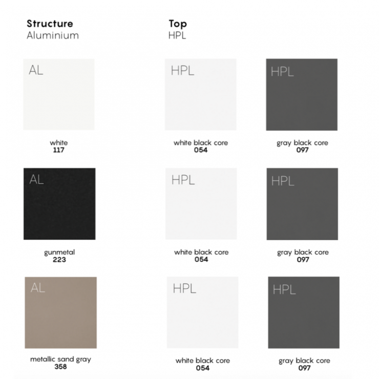 Fusto 3 razze in alluminio verniciato a polveri epossidiche in 3 colori (Bianco, Gunmetal o Metallic Sandgrey) da abbinare con top tondo in HPL in due colori (White black core o Grey black core) dallo spessore di 10 mm.