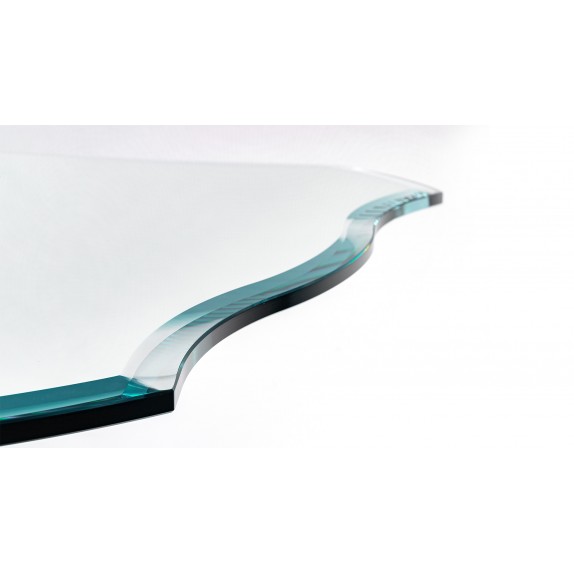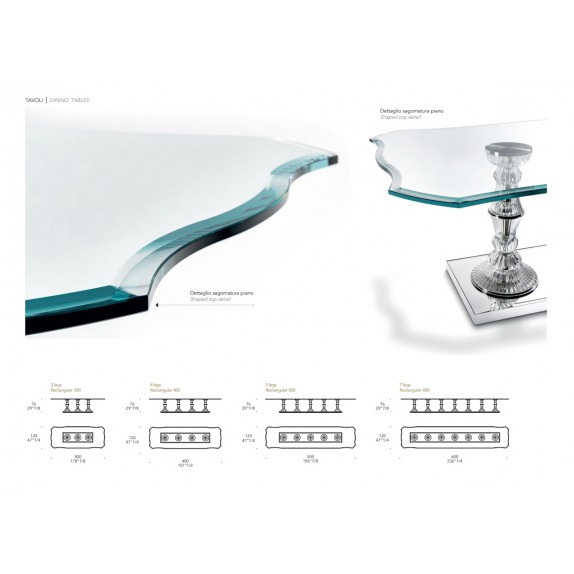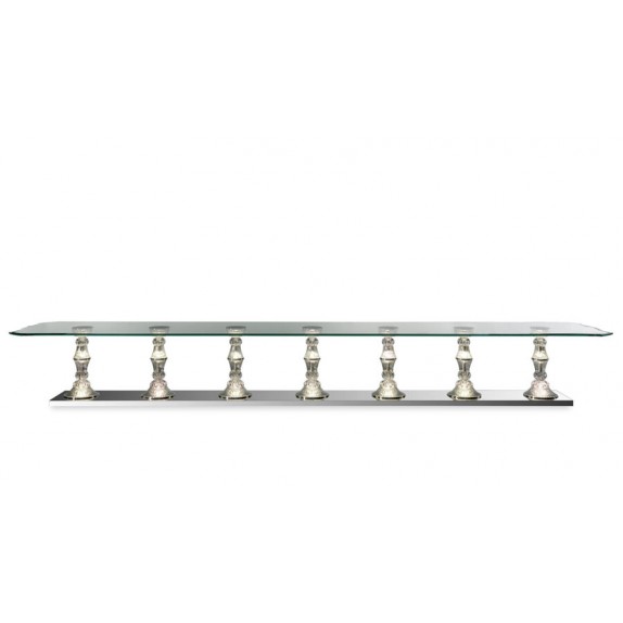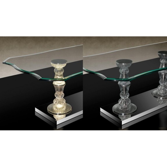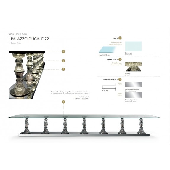 Tavolo pranzo con basi ad elementi in cristallo inciso. Zoccolo in vetro extrachiaro a specchio con bordo in acciaio supersilver. Piano in vetro extrachiaro sp. 19mm sagomato. Impianto luce LED per ogni base con batteria ricaricabile